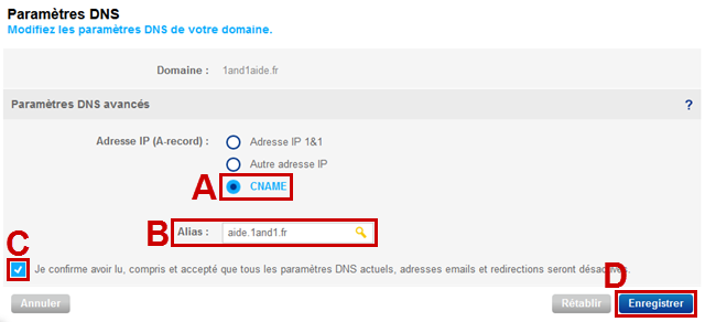 Attention, vous ne pourrez pas créer un alias CNAME si vous avez modifié les serveurs de noms autoritaires et que ceux-ci ne sont pas les serveurs de noms 1&1 ( voir Comment modifier les serveurs de noms chez 1and1 ?).