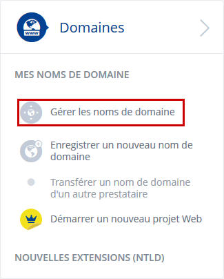 Il faut tout d’abord se connecter à l’espace client 1and1 puis choisir le contrat incluant le domaine dont vous souhaitez modifier les paramètres DNS ( si vous disposez de plusieurs contrats). En scrollant vers le bas, l’onglet « Domaines » apparait: cliquez sur « Gérer les noms de domaine ».
