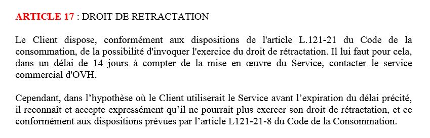 Comme d’habitude, il faut bien lire les conditions générales d’OVH (disponibles ci-après) auxquelles sont ajoutées d’autres conditions selon les services et particulièrement les passages comme celui-ci, qui annulent le droit de rétractation si on a utilisé le service.. Comme dans les sites de rencontres et avec le plus grand illogisme possible puisque COMMENT pourrait-on se rétracter d’un truc qu’on n’a pas essayé ??